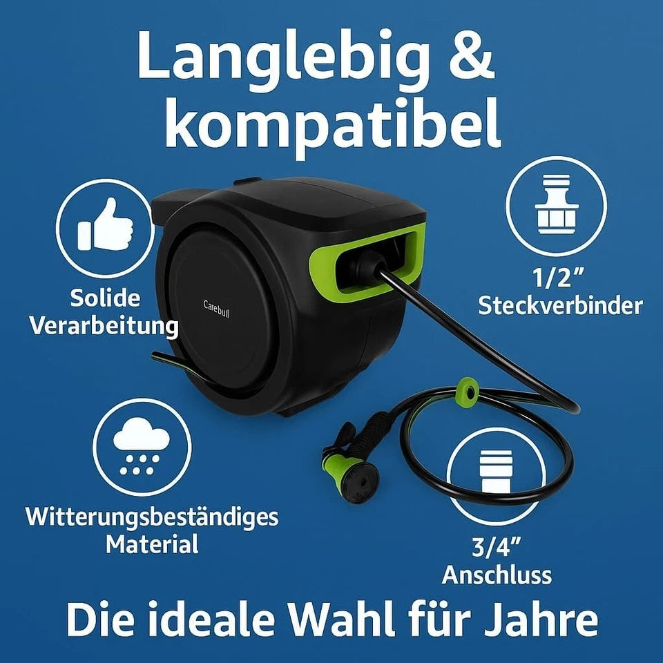 Set completo per uso immediato - Tutto incluso - Il set include: tubo da 25 m, tubo di collegamento da 2 m, supporto a parete, pistola a spruzzo con 7 funzioni, adattatore, connettore per tubo e carrello - nessun acquisto aggiuntivo necessario.