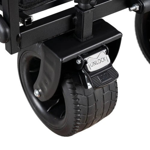 RUOTE STERZANTI LARGHE : il carrello è dotato di ampie ruote con battistrada realizzate in materiale PP di alta qualità che garantiscono stabilità e facilità di manovra su varie superfici . Le ruote nella parte anteriore del carrellino sono girevoli a 360 gradi, consentendo una sterzata precisa e facili manovre in spazi ristretti. Inoltre, sono dotati di freni/blocchi che garantiscono sicurezza e stabilità durante le operazioni di carico e scarico. Le grandi ruote battistrada assicurano che il carrello possa percorrere facilmente sia una spiaggia sabbiosa che un terreno non asfaltato in giardino .