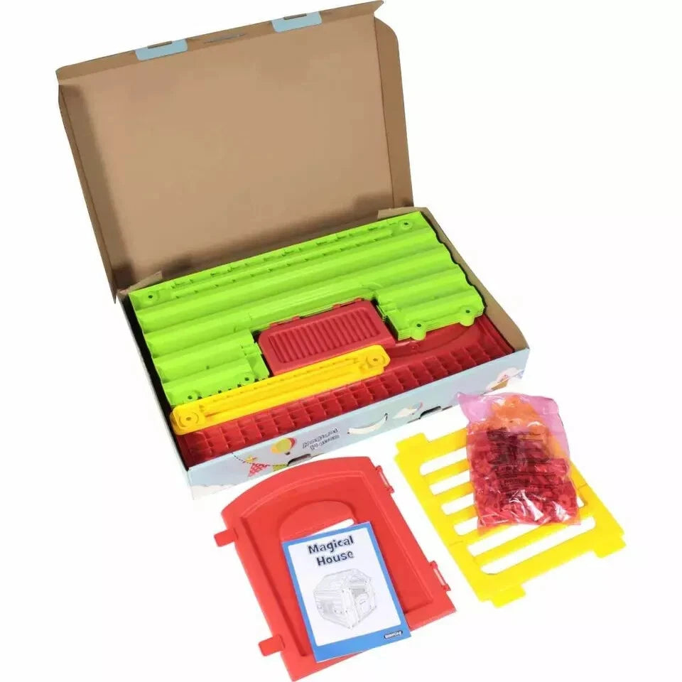 Casa in plastica multicolore con decorazioni e finiture a rilievo. Dotata di porta e finestre apribili .