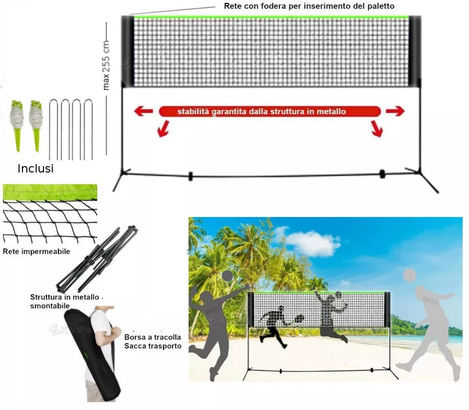 Rete con struttura metallica pieghevole completa portatile ideale per giocare in spiaggia, in giardino e al parco. Altezza rete regolabile , altezza massima 2,55 metri. Rete impermeabile con fodera per l'inserimento del paletto. Il set e' pratico e facile da trasportare grazie alla sacca in dotazione. Massima stabilità grazie alla struttura in metallo Particolarmente indicato per giocare a pallavolo, calcio tennis, tennis, badminton, ecc..